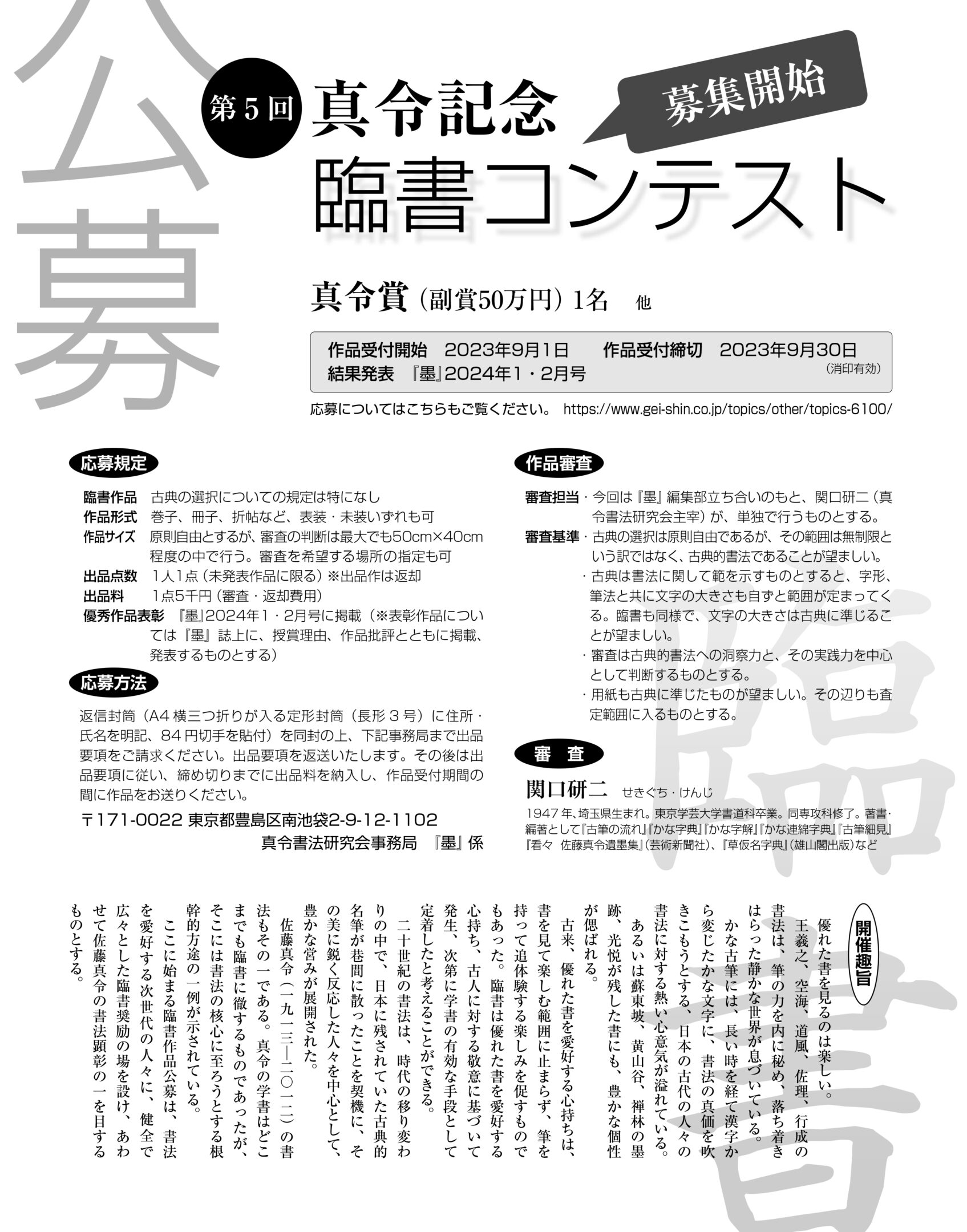 審査担当   今回は『墨』編集部立ち合いのもと、関口研二(真令書法研究会主宰)が、単独で行うものとする。