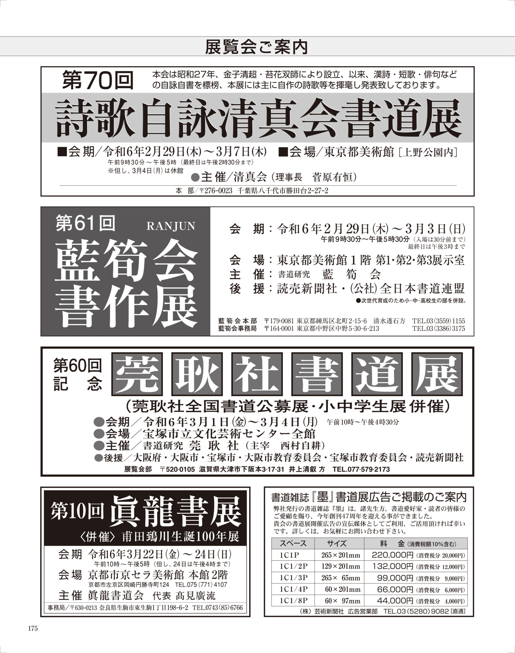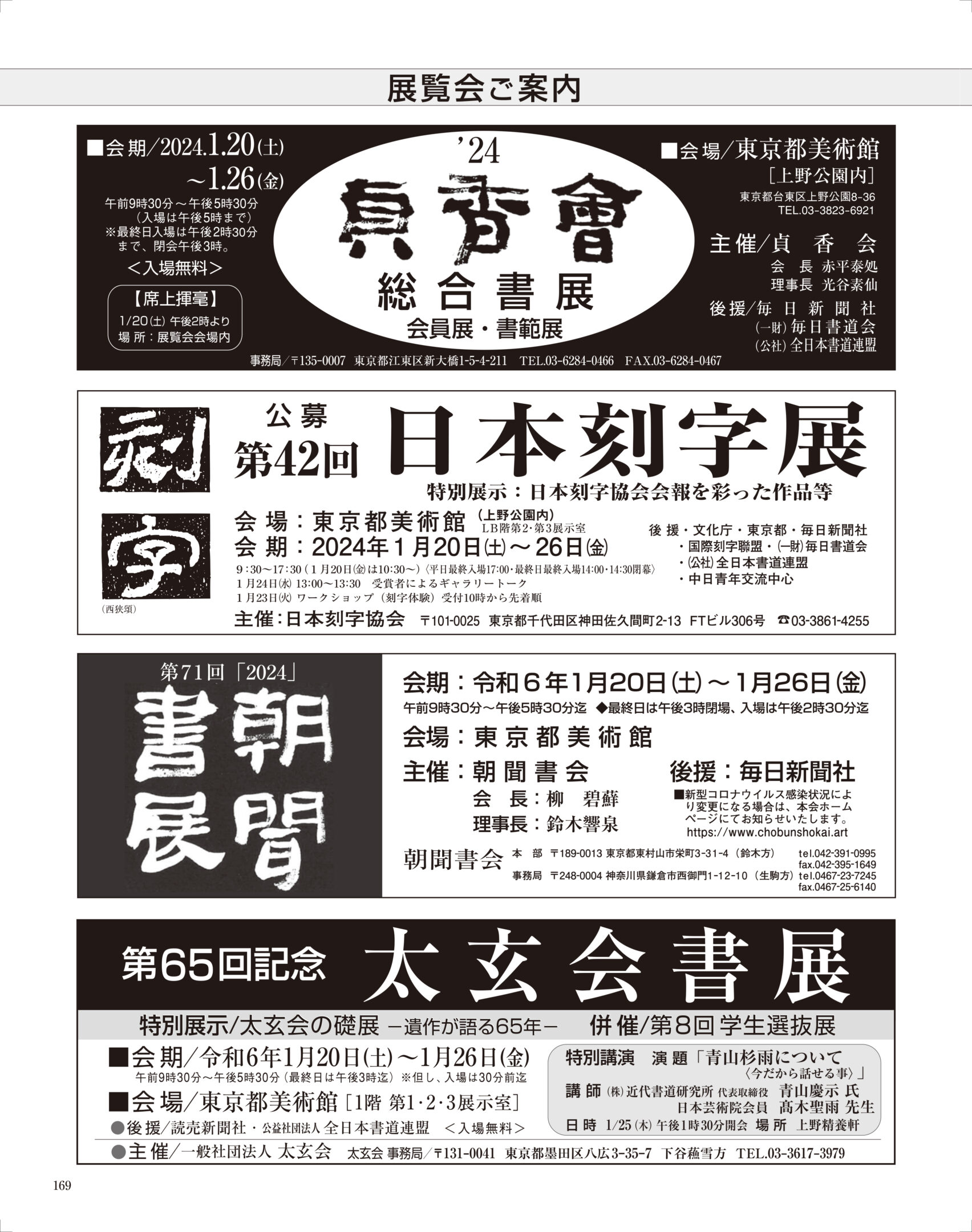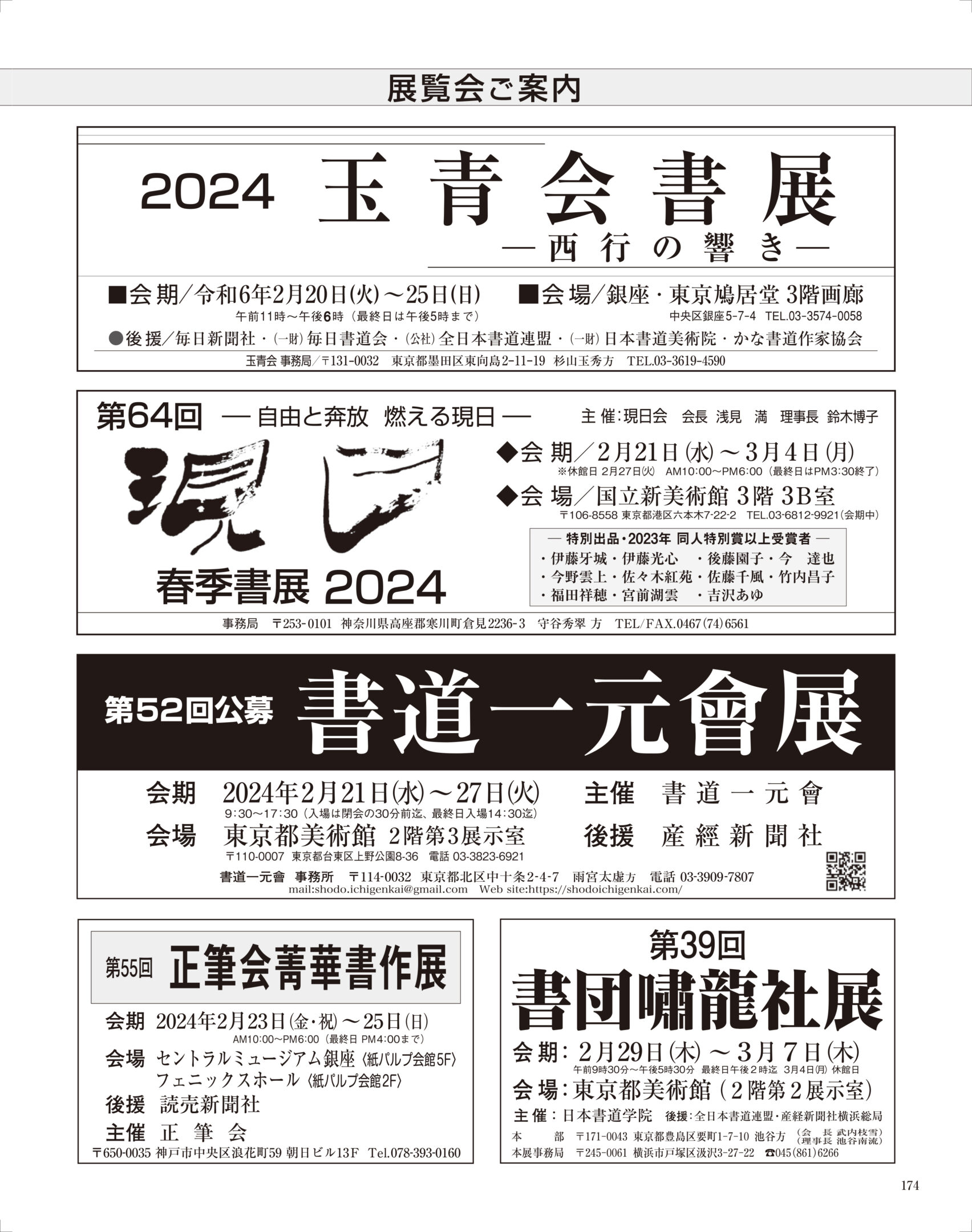 TOP > トピックス一覧 > 2024年1月〜3月に開催される書道展のご案内 2024年1月〜3月に開催される書道展のご案内 『墨』2024年1・2月号 286号にご出稿いただいた書道展広告をご紹介いたします。 展覧会めぐりにお役立てください。 関連書籍 バックナンバー 墨2024年1・2月号 286号 2023年12月28日 関連記事 トピックスその他 2025.12.19 『墨』大学卒業制作展 掲載校募集 *クリックで募集案内画像を拡大します* 大学卒業制作… トピックス一覧ページへ